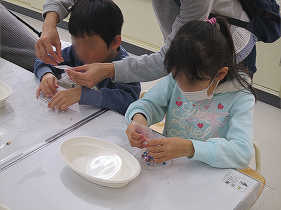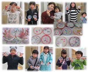 プラスティックのフタにビーズを入れたり、絵を描いて