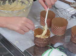 紙のカップ2個に生地の半分を入れて、残った生地にチョコチップを混ぜて
