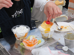 ホイップクリーム、フルーツなどを盛り付けるよ!