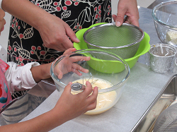 泡だて器でさらに混ぜた後、粉を入れてさっくりと混ぜるよ。