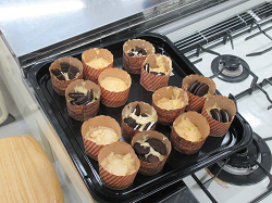 紙のカップ2個に生地の半分を入れて、残った生地にオレオクッキーを